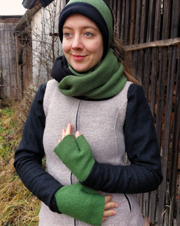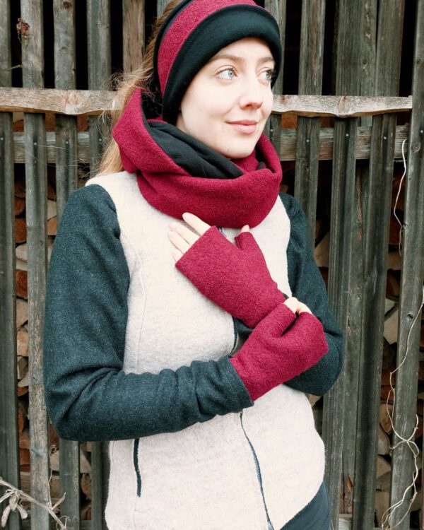 - - Stirnband- Länge: 68 cm, Breite: 14 cm - Loop - Länge: 140 cm, Höhe ca. 26 cm - Stulpen -Gesamtlänge 23,5 cm, Breite Handrücken ohne Daumen: 8,5 cm Material: Außen: 100% Schurwolle Innen (Futterstoff): Bamwolljersey (95% Baumwolle, 5% Elasthan) - GOTS-zertifiziert Farben: Dunkelblau meliert, Blau und Maisgelb, mit dunkelblauem Innenfutter. Anthrazit, Grün und Dunkelrot, mit schwarzem Innenfutter. Die…