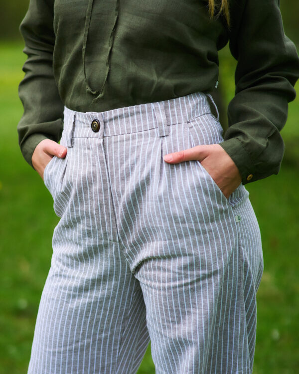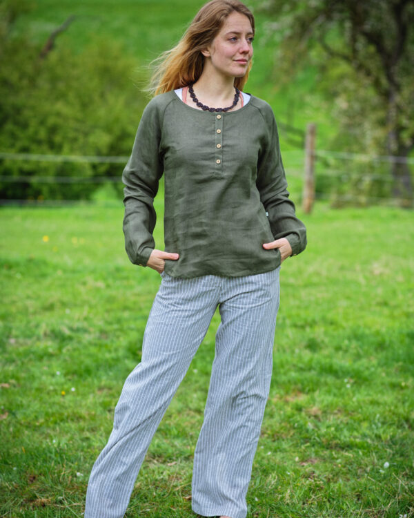 - - reines Hanf/Leinen - leichter Stoff - weites Bein für Bewegungsfreiheit - Seitentaschen Material und Farben: In Koriander aus 100% Hanf. In Grau-Weiß gestreift aus 100% Leinen.
