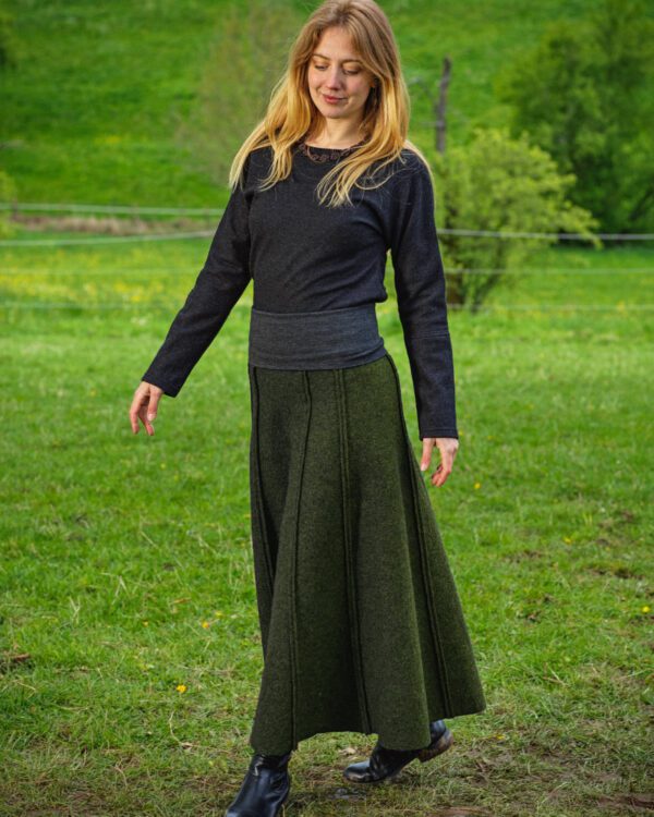 - - reine gewalkte Schurwolle - knielang - Mehrbahnenrock - Länge mit Bund 55cm Material:100% Schurwolle, Bund:93% Baumwolle 7% Elasthan - Oeko-Tex Standard 100 - Mulesing Free Farben: Anthrazit, Schokobraun, Brombeere, Dunkelblau, Dunkelrot, Grün, Maisgelb, Petrol Die Farbdarstellung des Produkts kann medienbedingt abweichen.