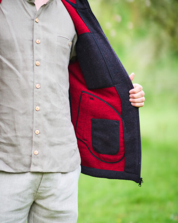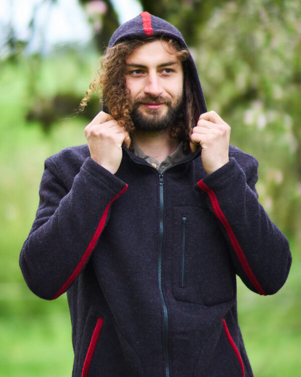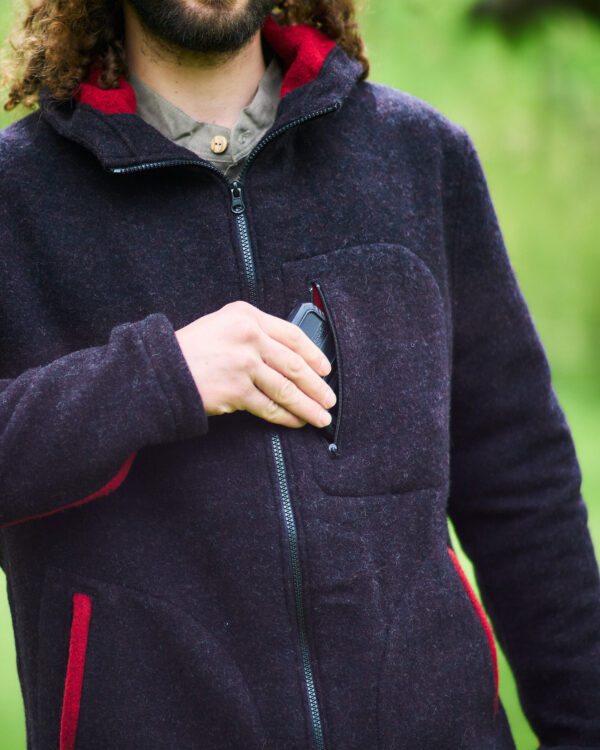 - Gerader, komfortabler Schnitt Kapuze für Wind & Wetter 100 % Schurwolle (mulesingfrei) 500 g/m Doubleface‑Walk, beidseitig leicht angeraut Made in Germany, frei von Kunststoffen Außen Anthrazit und innen Rot Zwei seitliche Einschubtaschen Brusttasche mit Reißverschluss Zwei kleine Innentaschen für Handy, Schlüssel & Co. Material: 100% Wolle Double-face (Mulesing Free) Farben: Anthrazit mit Rot