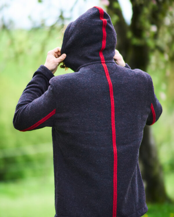- - gewalkte Schurwolle - warm und atmungsaktiv - taillierte Passform - große Bauchtasche - gefütterte Kapuze Material: 100% Schurwolle, Innenfutter Kapuze: 97% Baumwolle, 3% Elasthan (GOTS-zertifiziert) Flechtband: 100% Wolle - RWS-Responsible Wool Standard Farben: Dunkelblau, Dunkelrot, Maisgelb, Grünbraun meliert