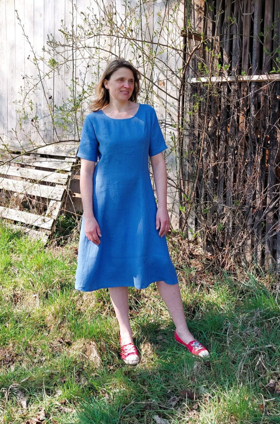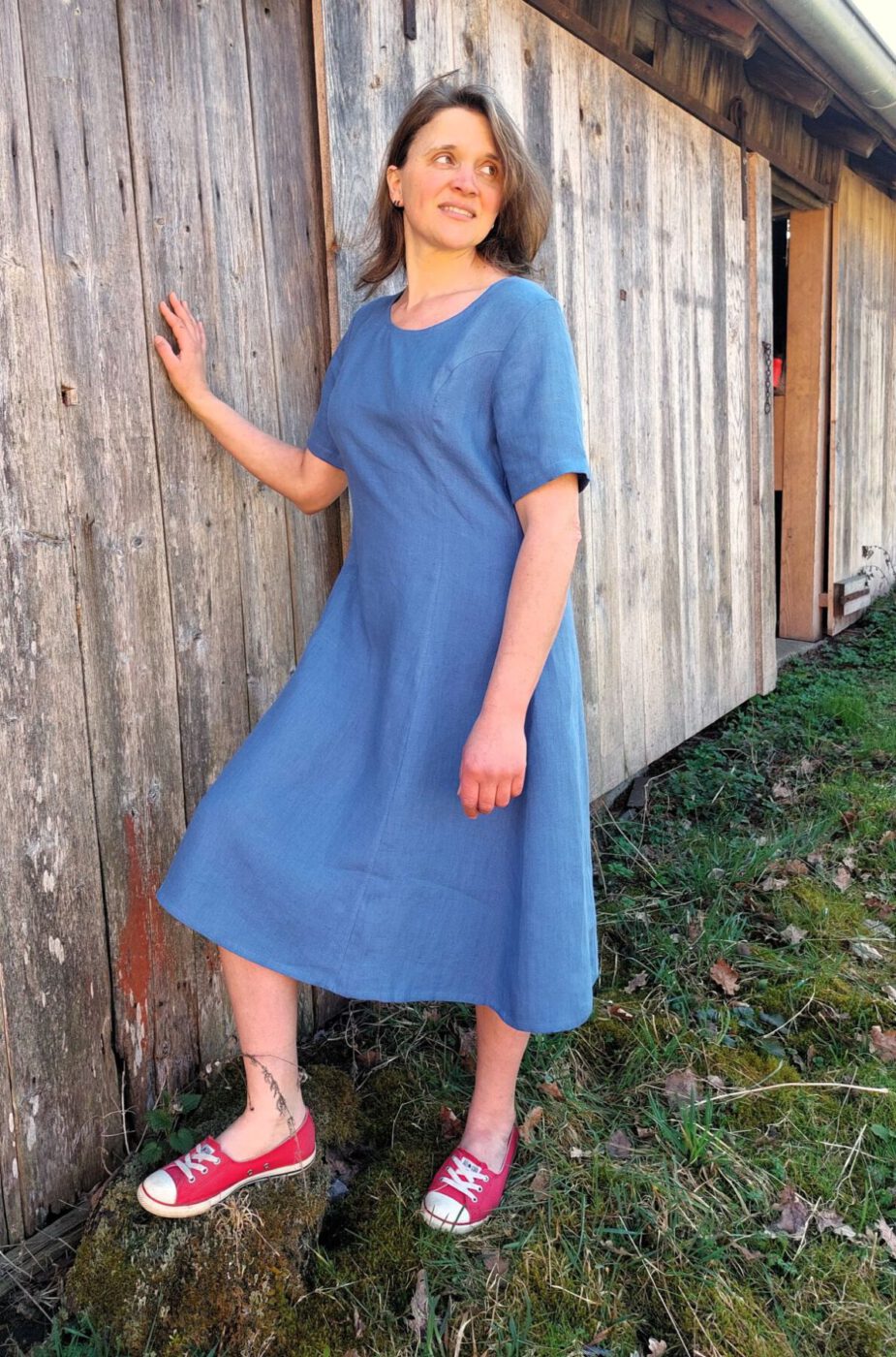 Unser A-Linienkleid fertigen wir aus einem hochwertigem Hanf. Das Kleid verfügt über kurze Ärmel, einen eleganten Rundhalsausschnitt und einen schmalen Schulter- sowie Oberkörperbereich. Am Rücken wird das Hanfkleid über einen nahtverdeckten Reißverschluss geschlossen. Ab der Taille ist das Rockteil ausgestellt, was eine fließende Silhouette schafft und Ihre Bewegungen anmutig begleitet. Das Kleid endet kurz über dem Knie und bietet damit eine perfekte Länge für verschiedene Anlässe.