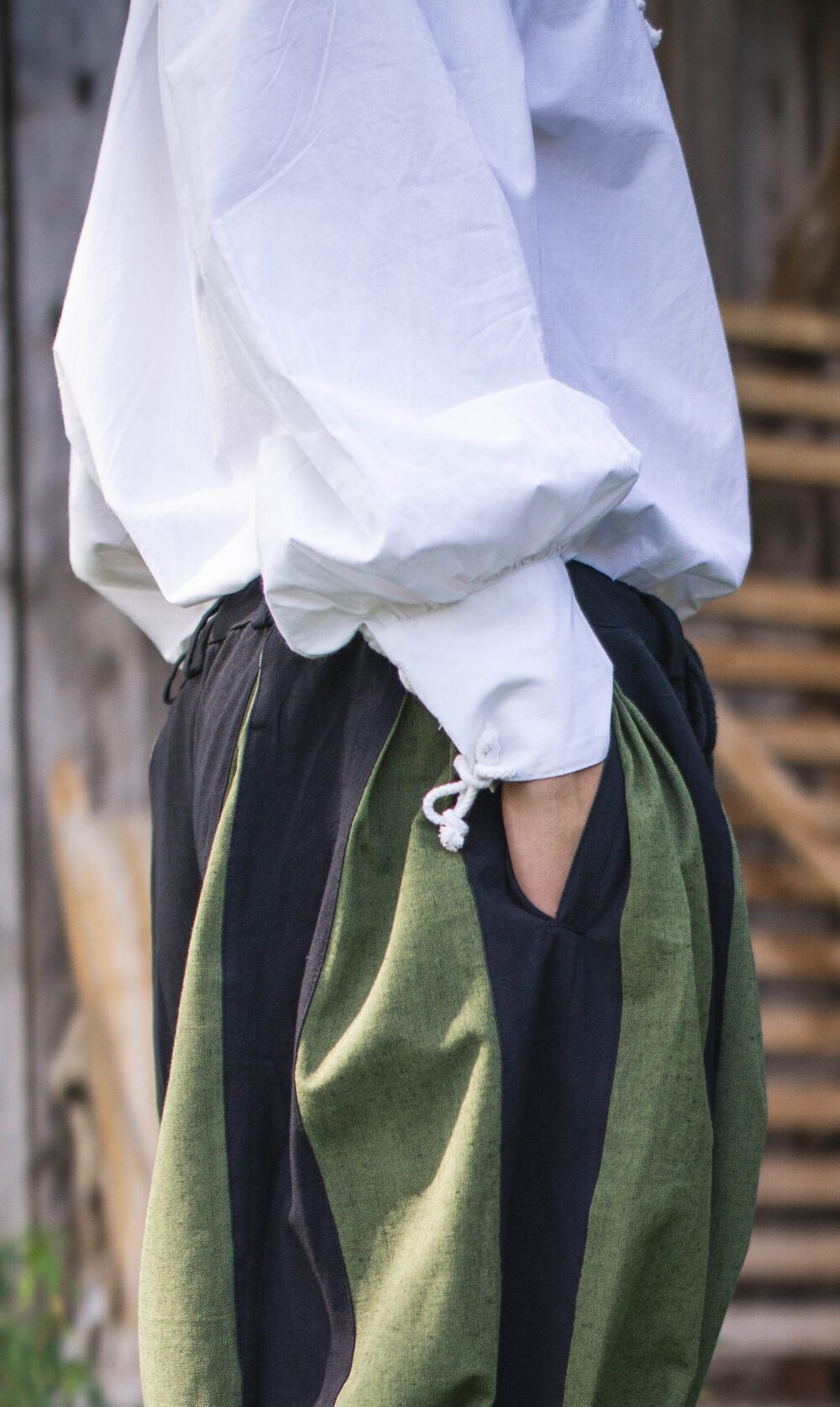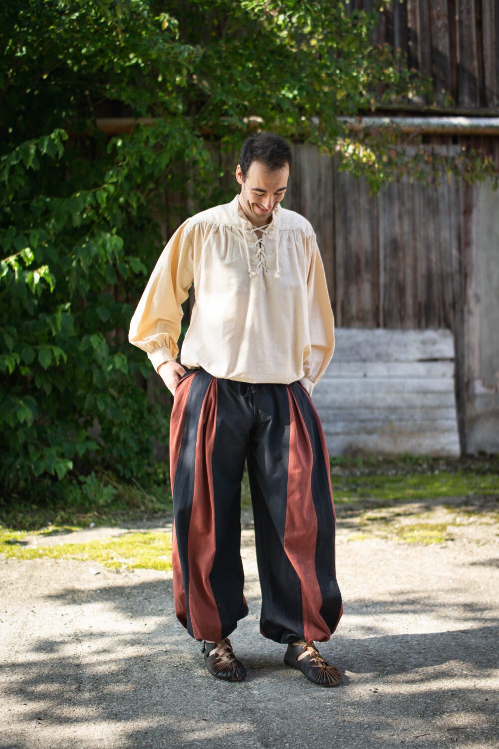 Landsknechtshosen stammen aus dem späten 15. bis frühen 16. Jahrhundert. Besonders im 16. Jahrhundert trugen die Landsknechte diese auffälligen, zweifarbigen Hosen, die den extravaganten Stil der Renaissance widerspiegeln und sowohl praktisch als auch dekorativ gestaltet waren.