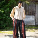 Die Hose besteht aus langen, zweifarbigen Bahnen. Man reguliert den Bund einfach mit einem Kordelzug, außerdem kann die Hose durch zusätzliche Schlaufen mit einem Gürtel angepasst werden. Der geknöpfte Eingriff bietet zusätzlichen Komfort. Darüber hinaus fügen seitliche Taschen Funktionalität hinzu. Die Hose reicht bis zum Boden und lässt sich am Knöchel schnüren, um eine bessere Passform zu sichern.