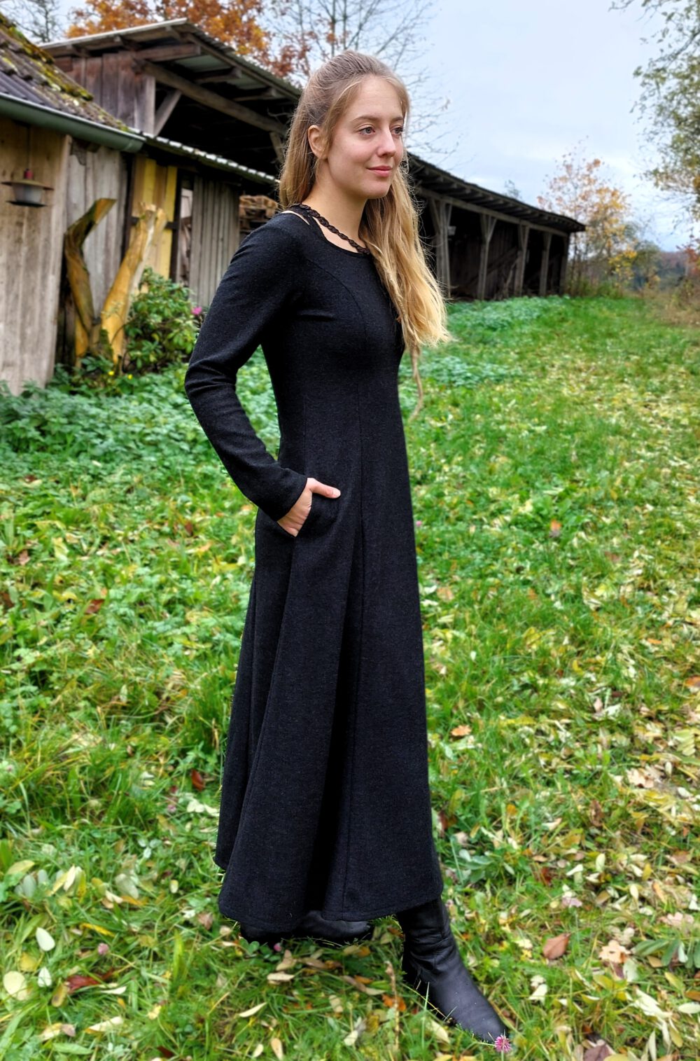Unser langes A-Linienkleid aus Schurwolle Modell Josefina stellen wir in Deutschland in eigener Schneiderei unter fairen und sozialen Vorgaben von Get Natural her.