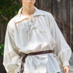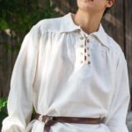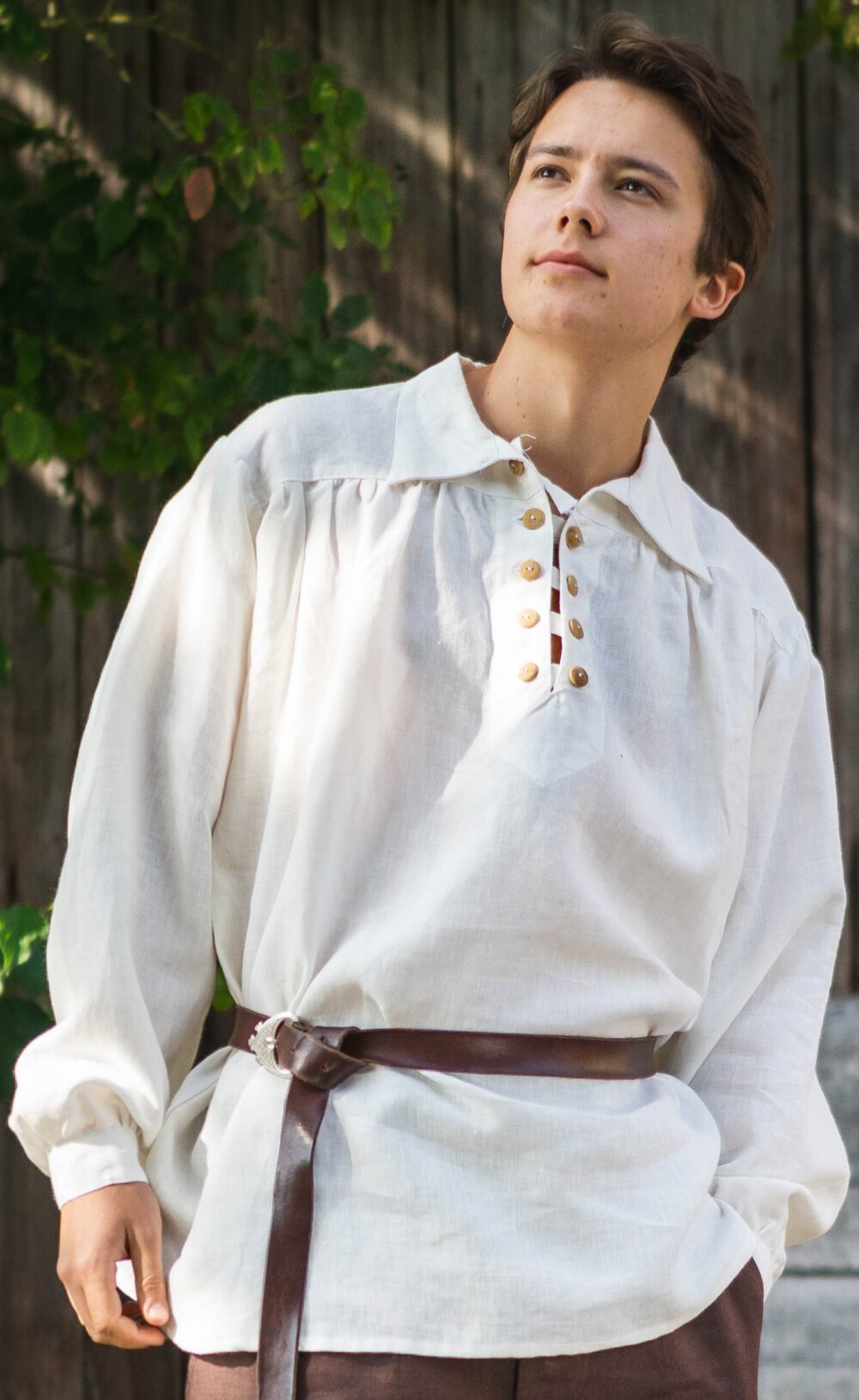 Dieses Hemd kann sowohl mit einer Doppelknopfleiste als auch als legeres Schnürhemd getragen werden. Die genähten Knopflöcher lassen beide Varianten zu und es werden sowohl Knöpfe als auch eine Kordel mitgeliefert. Die Ärmel sind mit geknöpften Manschetten am Handgelenk zu schließen. Zudem sorgt ein Einsatz unter den Armen für mehr Bewegungsfreiheit und erhöht den Tragekomfort. Oberhalb der Brust rafft sich der Stoff, was ebenfalls für mehr Bewegungsfreiheit sorgt.
