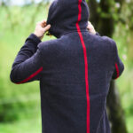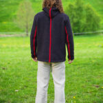 Außen präsentiert sich die Jacke in elegantem Anthrazit, während die Innenseite wahlweise in kräftigem Rot oder leuchtendem Gelb farbige Akzente setzt. Besonders an der Kapuze, Der Rückennaht und den Einschubtaschen treten diese Kontraste hervor.