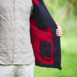 Zwei seitliche Einschubtaschen bieten Platz für Alltagsgegenstände, und die Brusttasche mit Reißverschluss hält Wichtiges sicher fest. Zusätzlich integrieren wir zwei kleine Innentaschen – ideal für Handy, Schlüssel oder andere Kleinigkeiten.