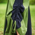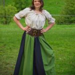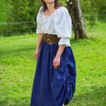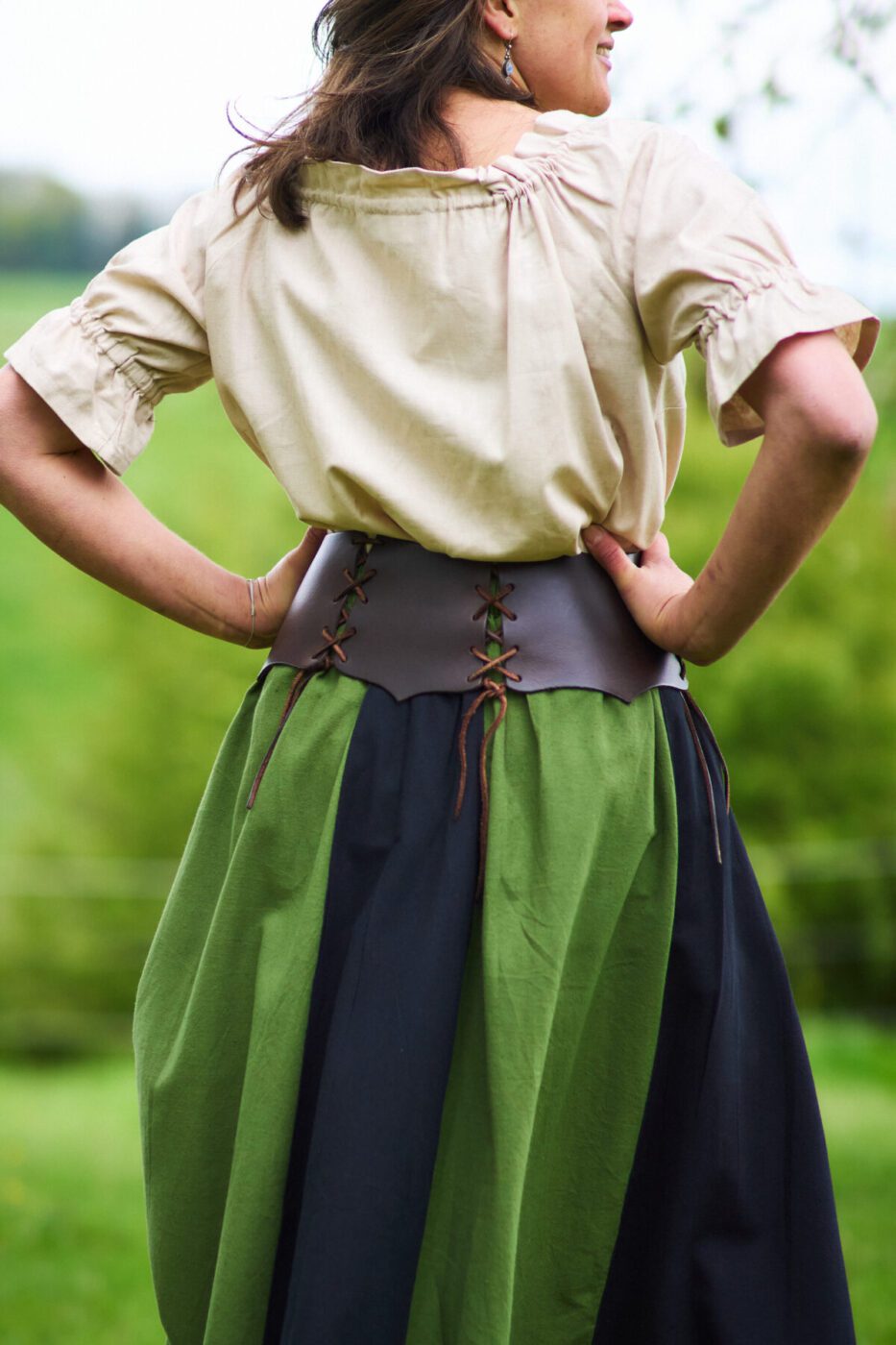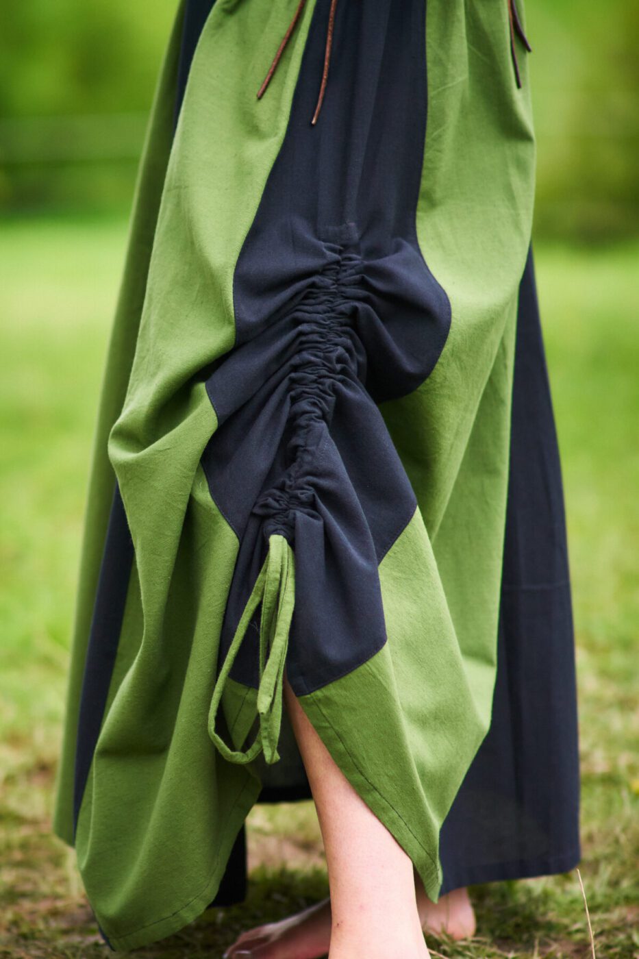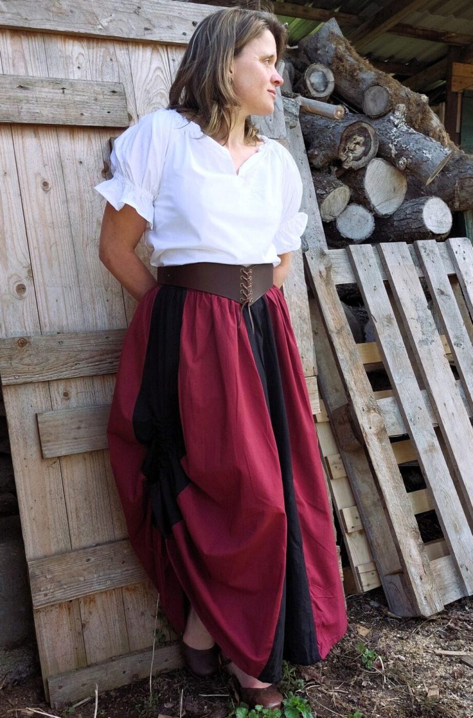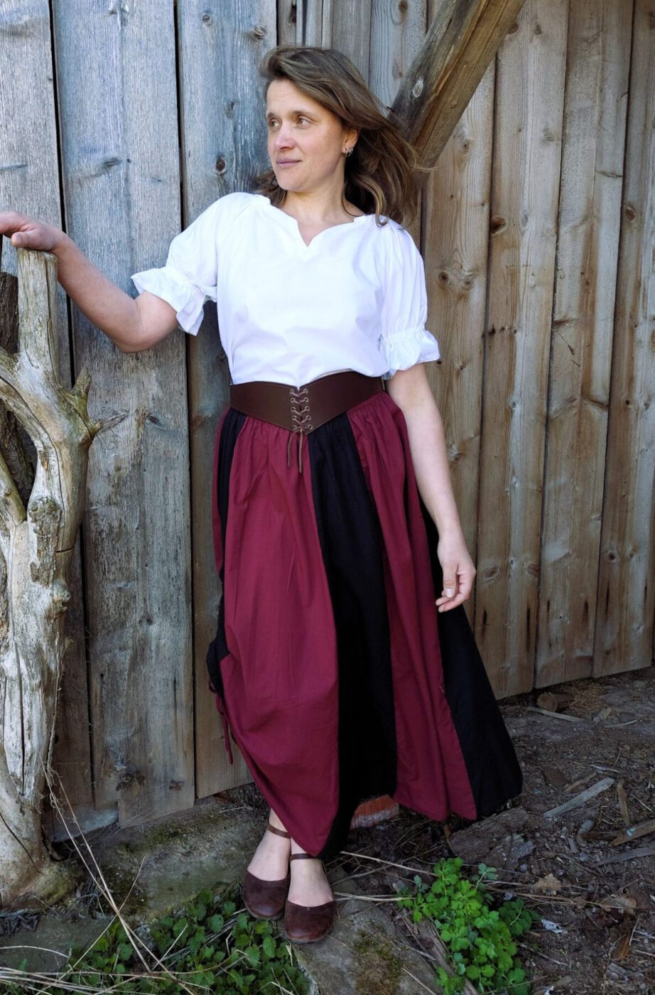 Der zweifarbige Baumwollrock ist als Bahnenrock entworfen und verfügt über eine geräumige Tasche, die in die Seitennaht des Rocks eingearbeitet ist. Zusätzlich kann der Rock seitlich über einen Tunnelzug nach oben gerafft werden. Daher lässt er sich perfekt mit einer Bluse sowie einem Mieder kombinieren.
