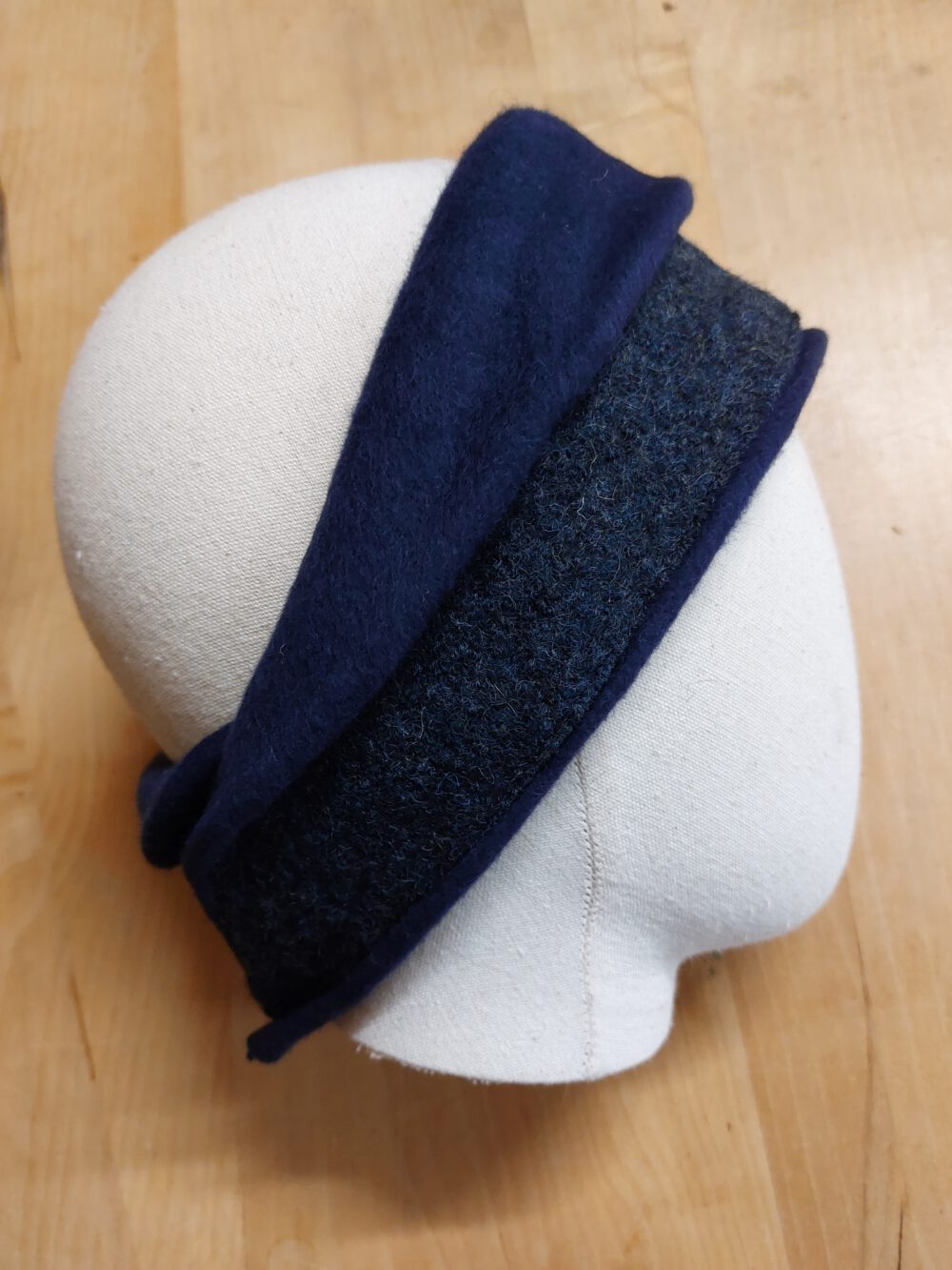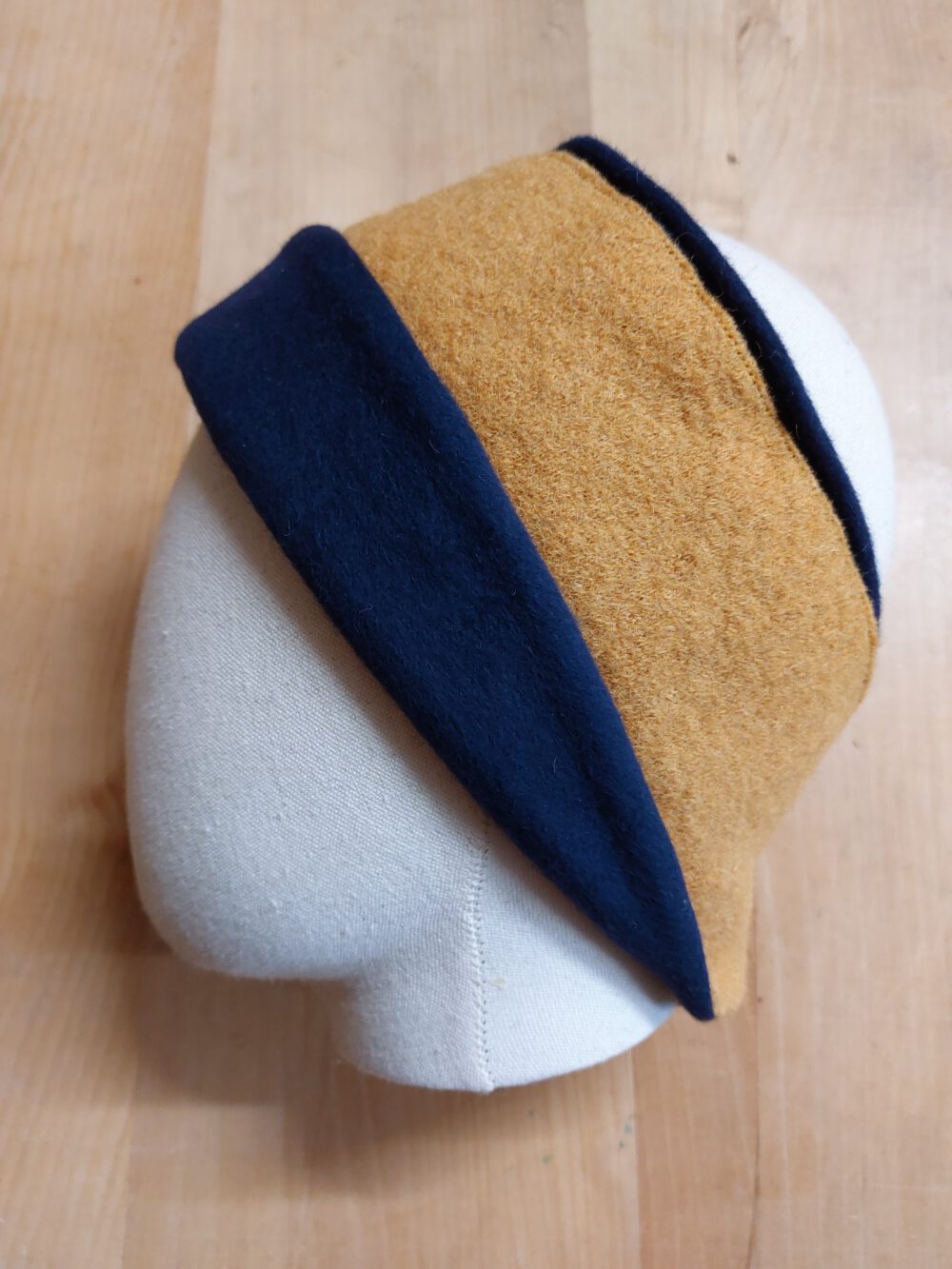 Farben: Dunkelblau meliert, Royalblau und Maisgelb, mit dunkelblauem Innenfutter.