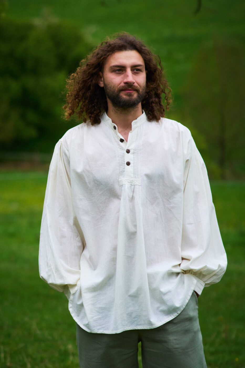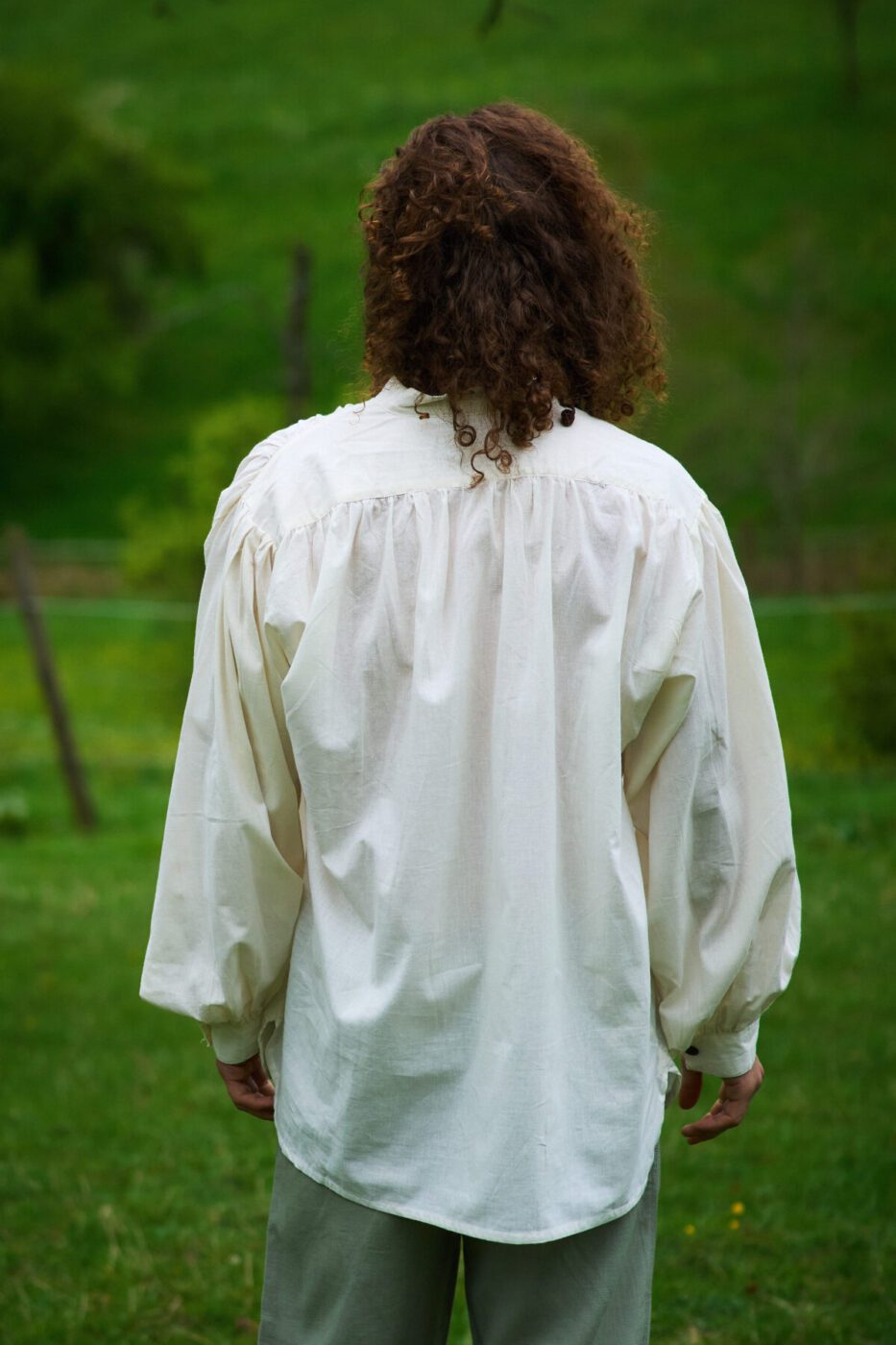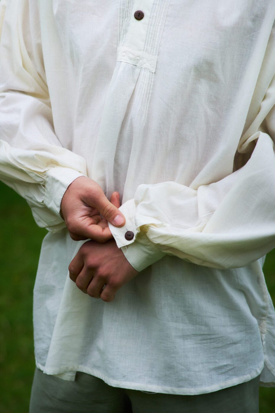 Das Hemd hat einen Stehkragen und traditionelle Biesen und Knöpfe nach Art der Zimmermannsleute. Es hat eine vierer Knopfleiste mit genähten Knopflöchern sowie weit geschnittener Ärmel mit geknöpfter Manschette am Handgelenk. Die Knöpfe sind aus Kokosnuss. Ein rautenförmiger Einsatz unter dem Arm sorgt für mehr Bewegungsfreiheit.